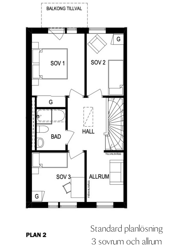 På övervåningen hittar du det stora sovrummet med en praktisk skjutdörrsgarderob och en inåtgående fransk balkongdörr som släpper in massor av naturligt ljus. För de som önskar en ännu större balkong finns möjligheten att anpassa ditt hem efter dina behov och önskemål.